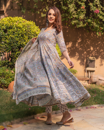 This three-piece Handblock suit set. Color: Grey Suit Set Fabric: Cotton Dupatta Fabric: Chanderi