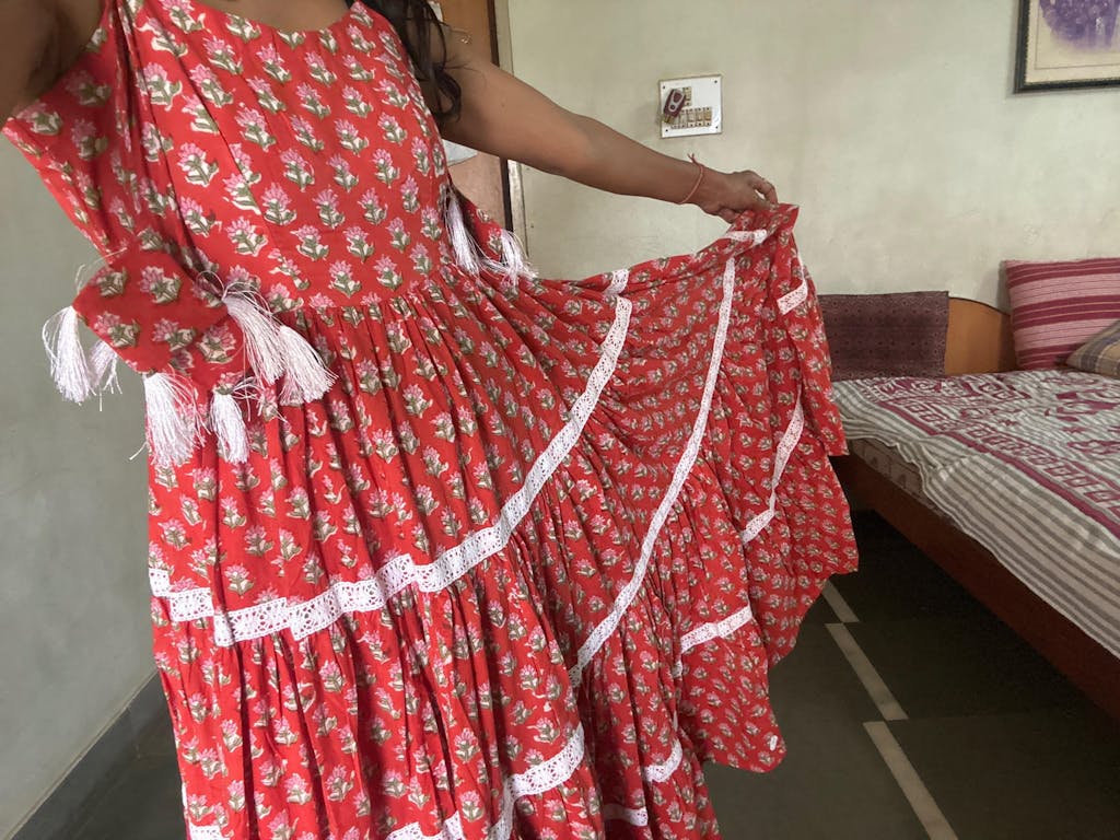 Orange Tier dress with handblock print all over it. Color: Orange Dress Fabric: Cotton Neckline: Round shape neck Sleeve: Sleeveless Handpainted: No CARE: Dry Clean Only Model Size: The model is wearing S Size Model Height: 5'7"