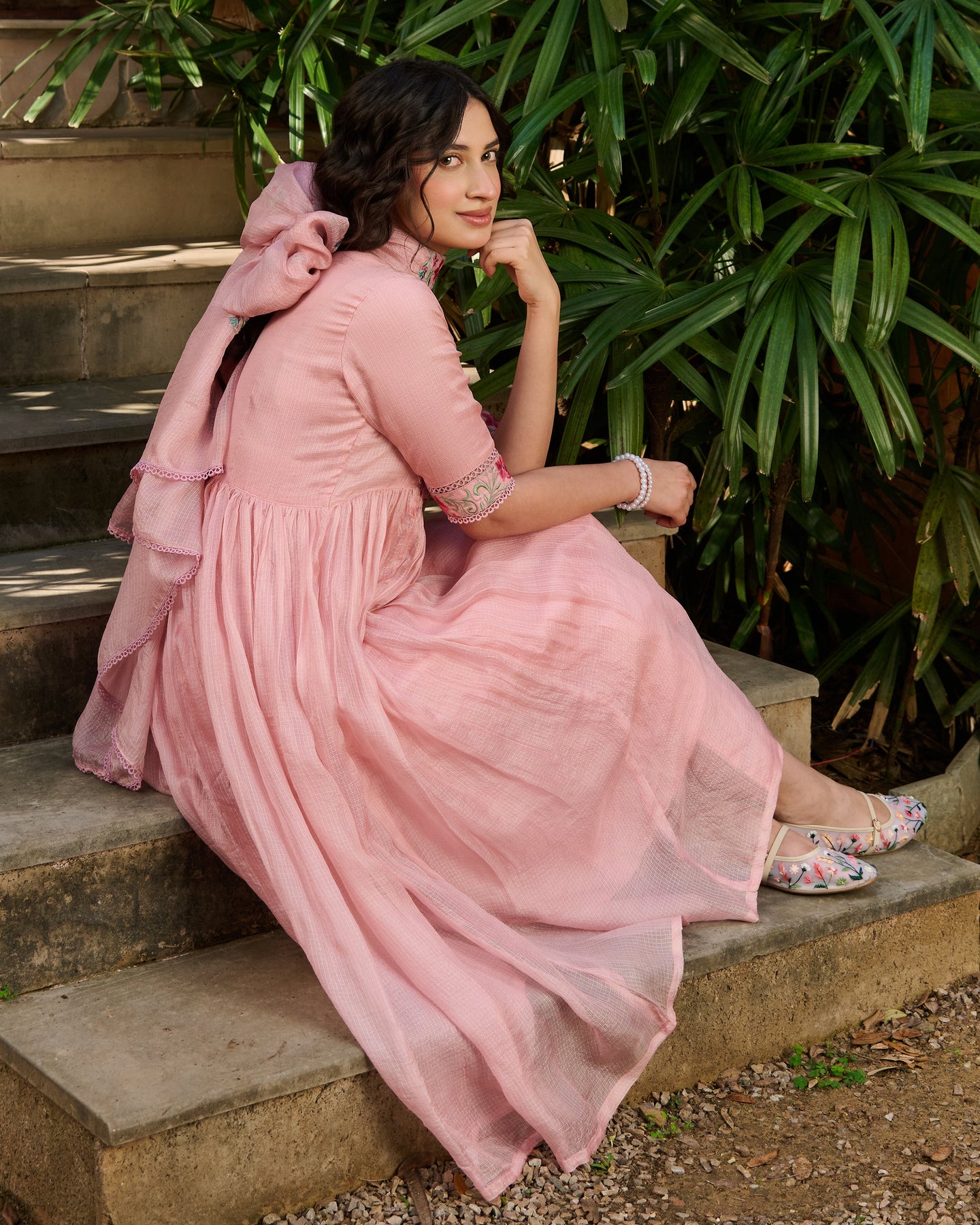 Sparrow Pink Green Colour Blocking Embroidered Cotton Dress