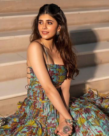Flaunting a gorgeous cut that looks straight out from the paradise, Sanjana is casting a love spell in our Zahira Chanderi Lehenga Set. With its ultra glam neckline and stunning print details set in cool tones, Sanjana in this lehenga set is stealing our hearts.