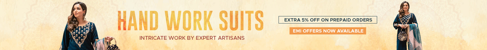 From georgette hand work suit sets to gota patti salwar suits, Aachho has a plethora of styles, fabrics, and patterns of hand work suits. Some of the most popular suit sets are: