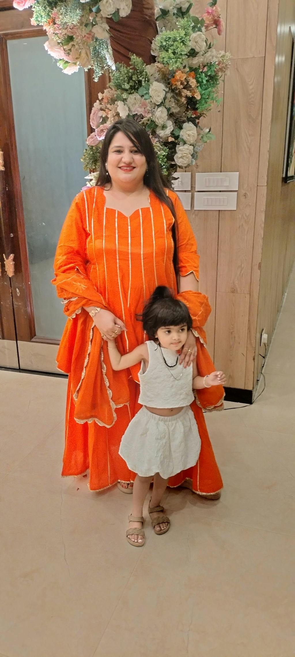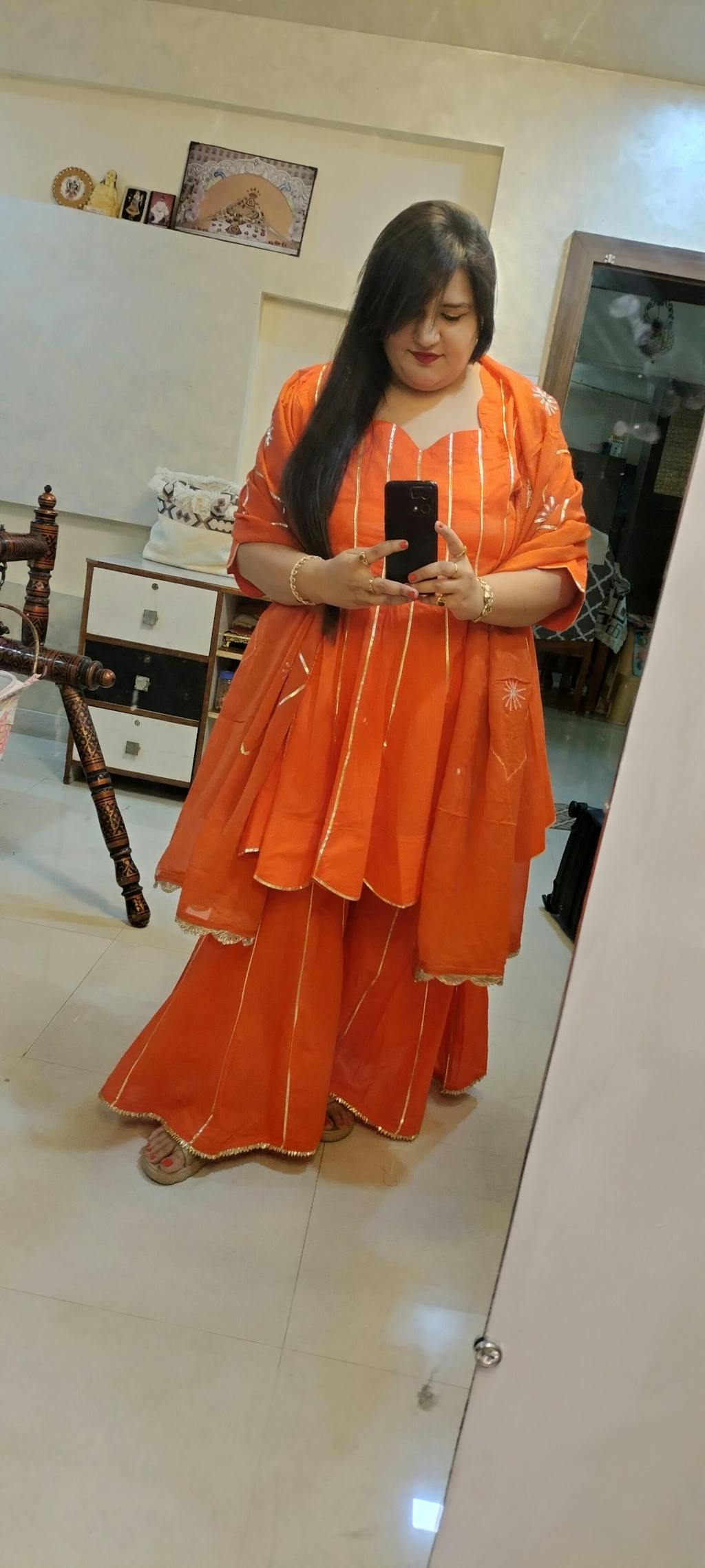 Color: Orange Suit Set Fabric: Cotton Dupatta Fabric: Organza
