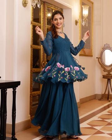 Immerse yourself in the enchanting beauty of our Kaasni Handpainted Viscose Organza Sharara Set, painted in the depths of dark blue like a star-studded midnight sky. Perfect companion for weddings, festivals, and all your cherished occasions, this masterpiece from our new collection will elevate your presence everywhere you go.