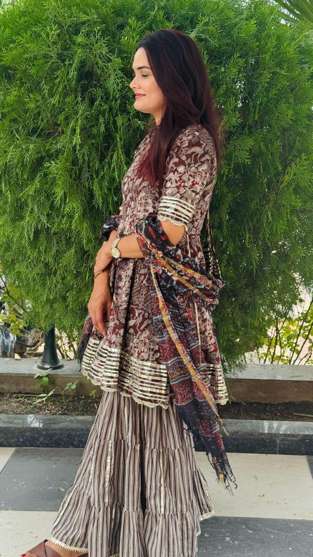 Indulge in the rustic luxury of the handblock art and drape yourself in the prints inspired by the enchanting forest life with our Baori Handblock Gotapatti Sharara Set. Being a masterpiece, preserving the ancient textile artform of Rajasthan, this sharara set beautifully blends the contemporary aesthetics through its stunning neckline, flowy style and twirl-worthy flare.