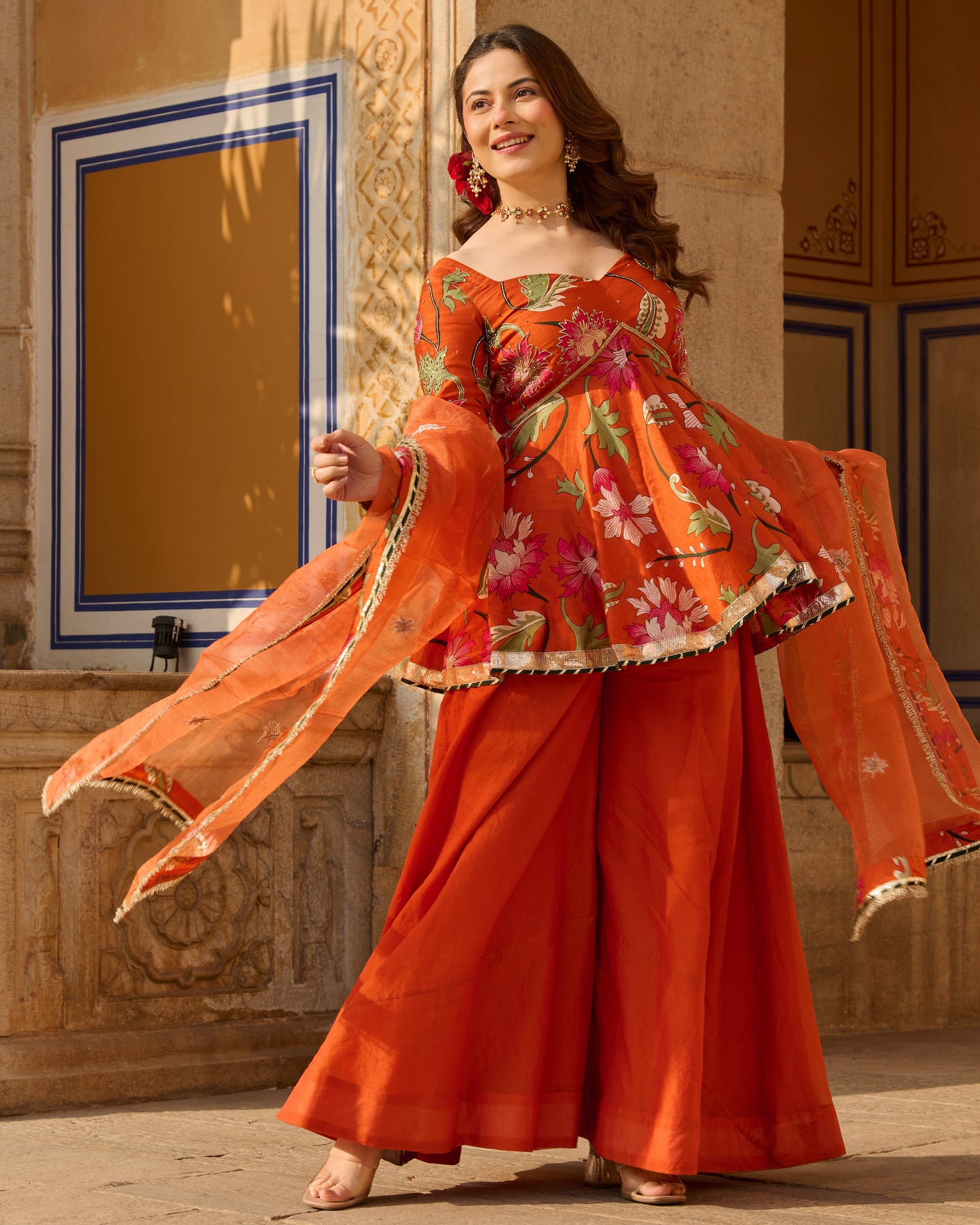 Mehar Orange Printed Chanderi Suit Set