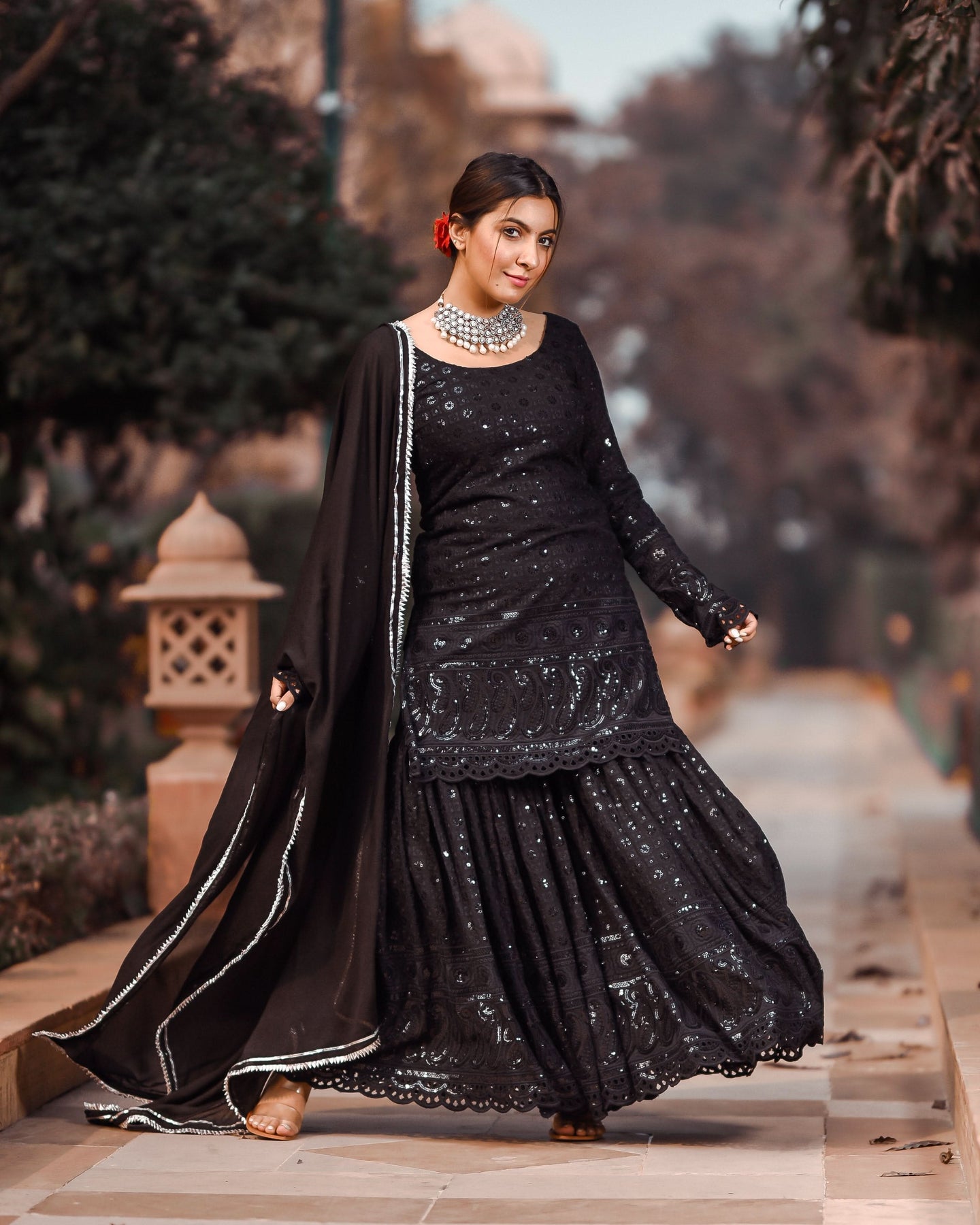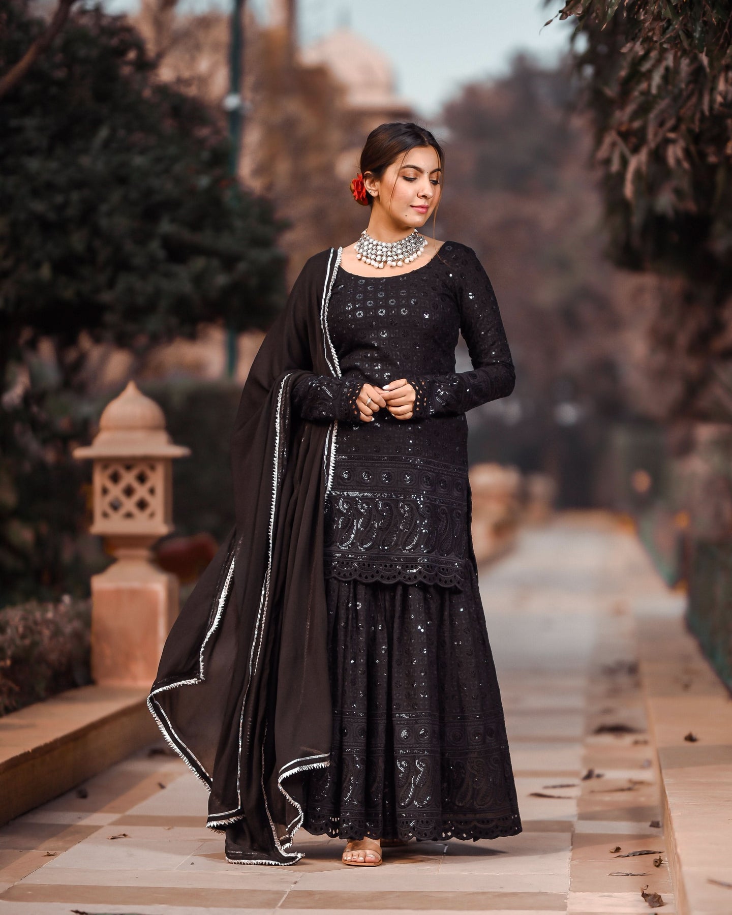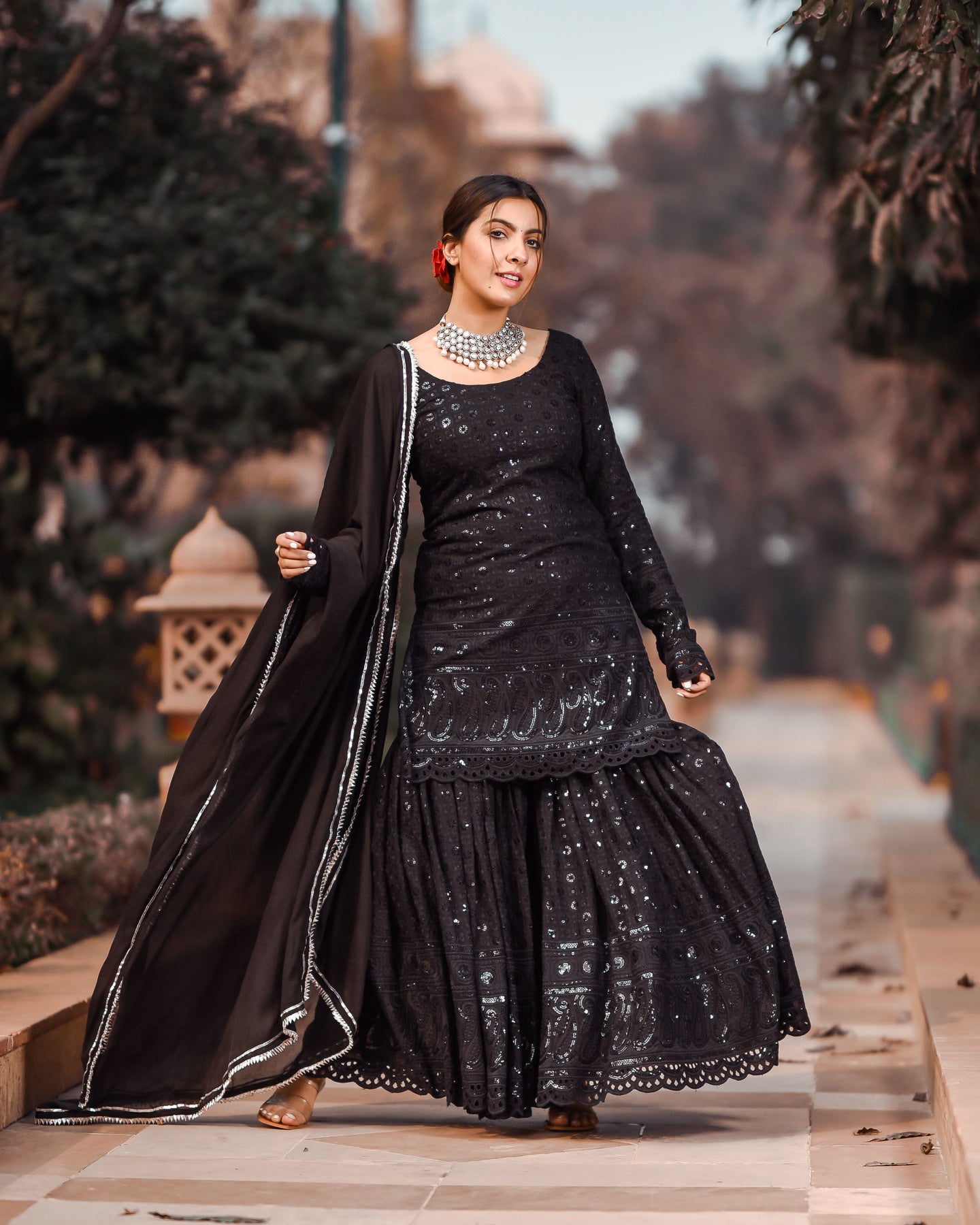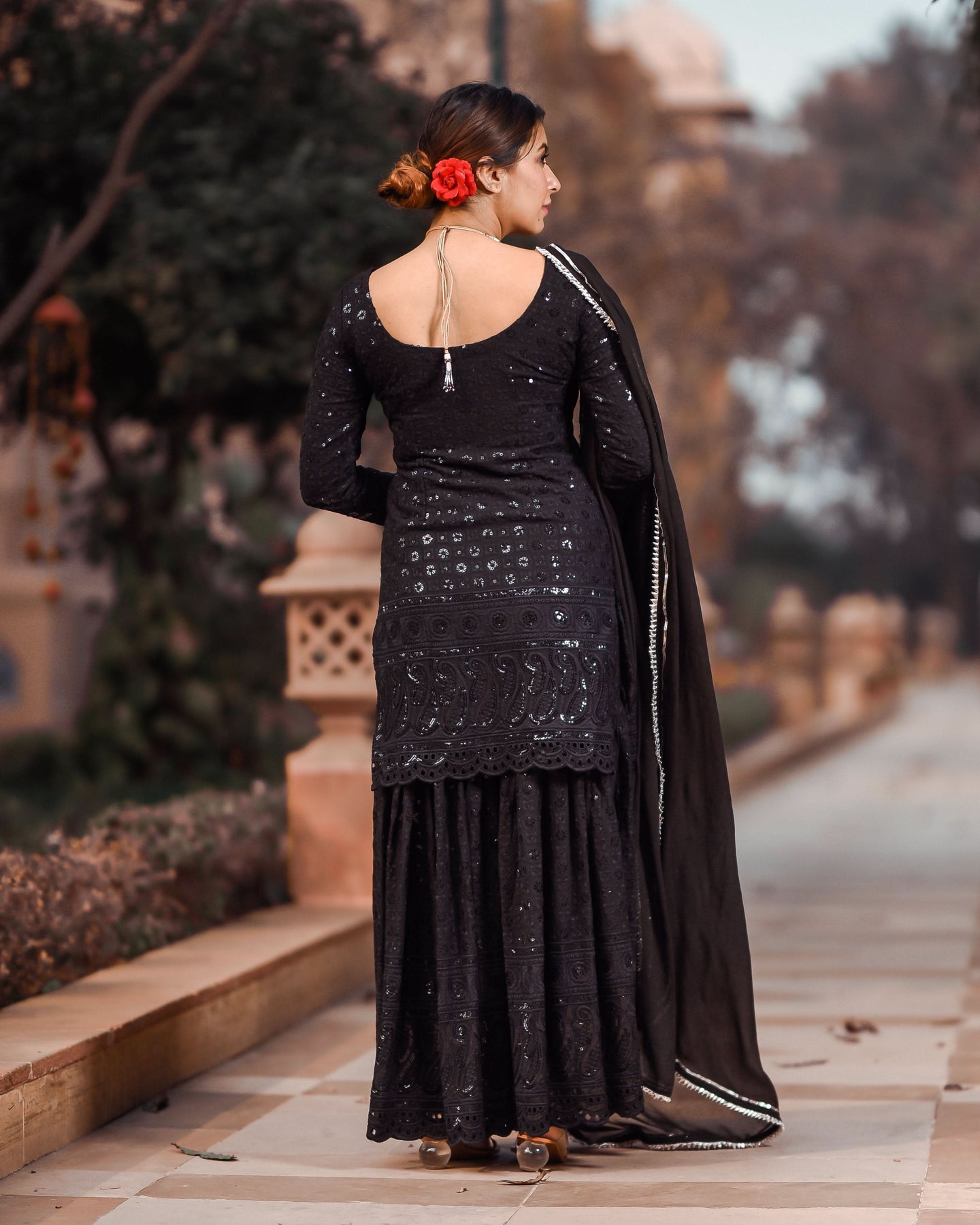 Jade Black Sharara Set paired with sharara and dupatta. This suit set is adorned with embroidery sequin handwork all over it.