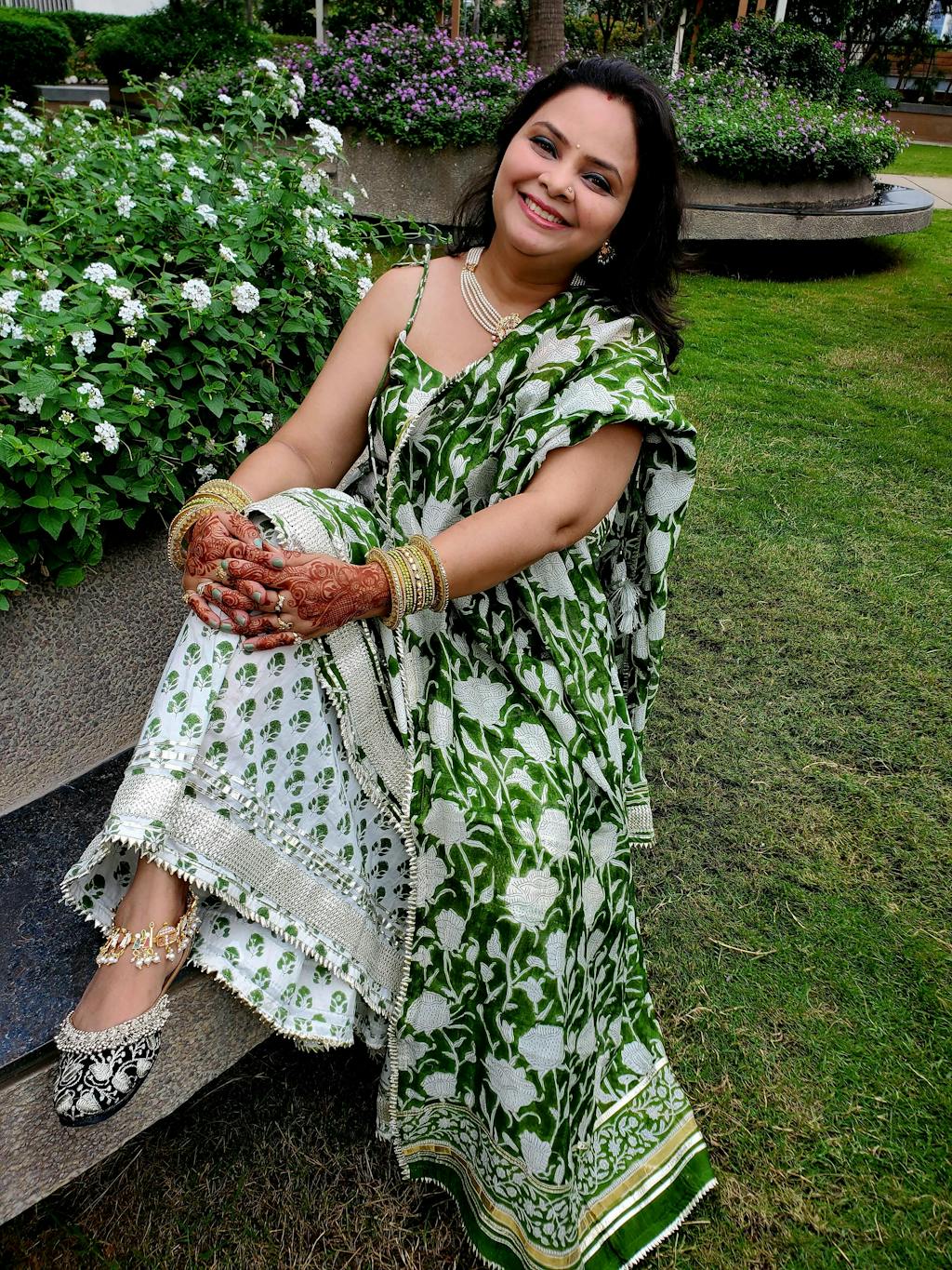 This three-piece Handblock Sharara suit set. Color: Green/White Suit Set Fabric: Cotton Handblock Dupatta Fabric: Chanderi