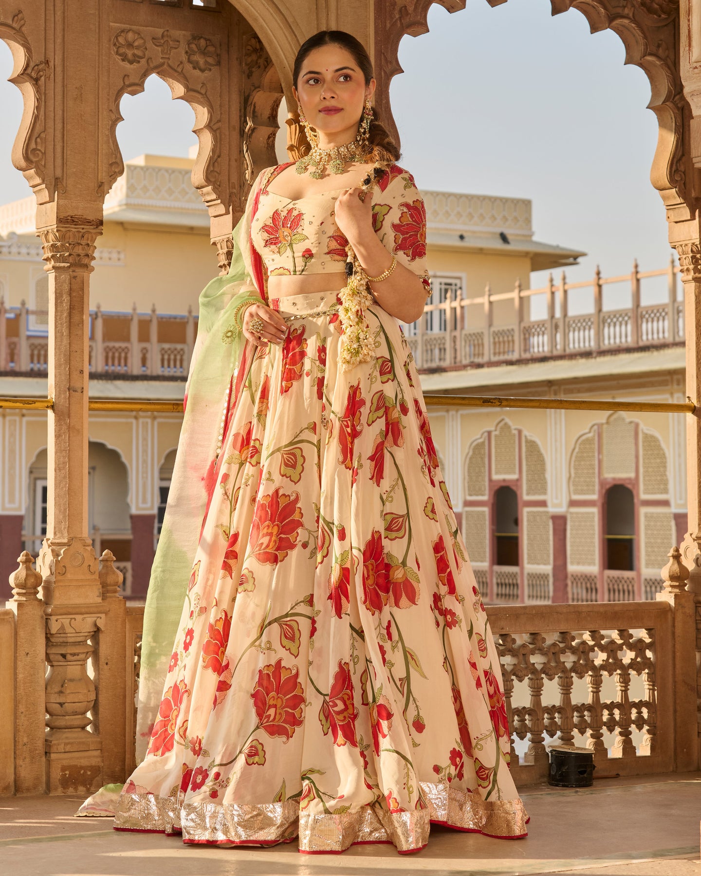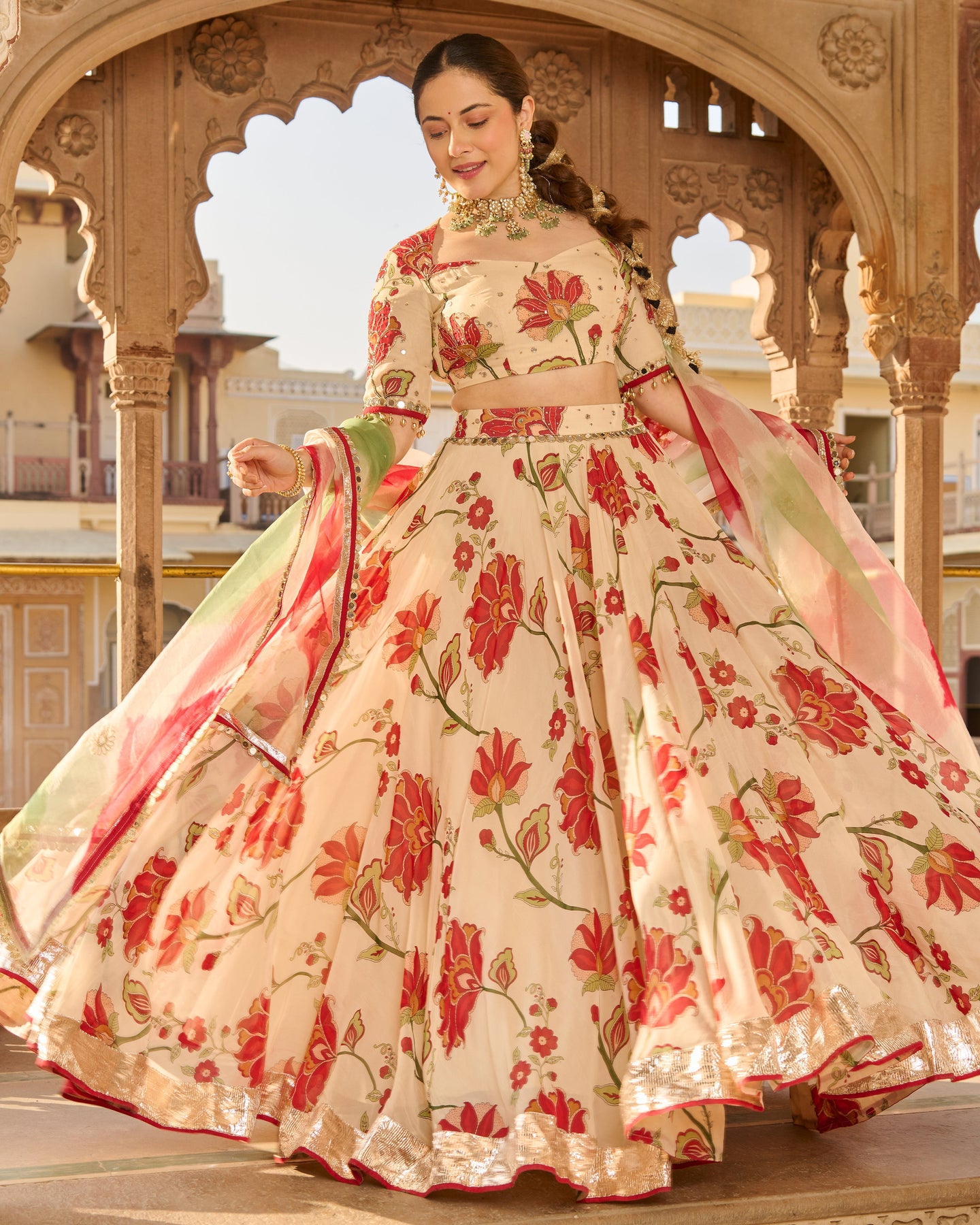 Fiza Cream Printed Viscose Organza Lehenga Set