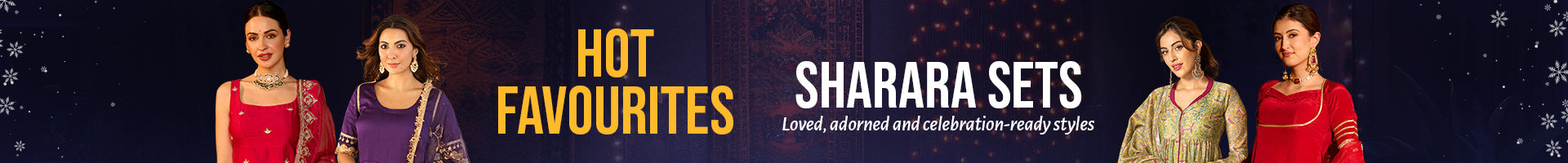 Shop By Color: Black Sharara | Blue Sharara | Brown Sharara | Green Sharara | Maroon Sharara | Peach Sharara | Pink Sharara | Purple Sharara | Red Sharara | White Sharara | Yellow Sharara.