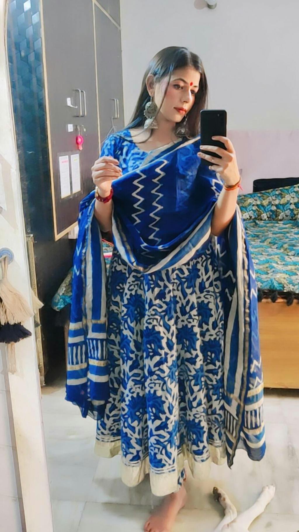 This three-piece gota patti anarkali suit set. Color: Indigo blue Dress Fabric: Cotton Dupatta Fabric: Chanderi Neckline: Round neck Sleeve: Elbow sleeves Handblock: Yes CARE: Dry Clean Only Model Size: Model is wearing S Size Model Height: 5'9"