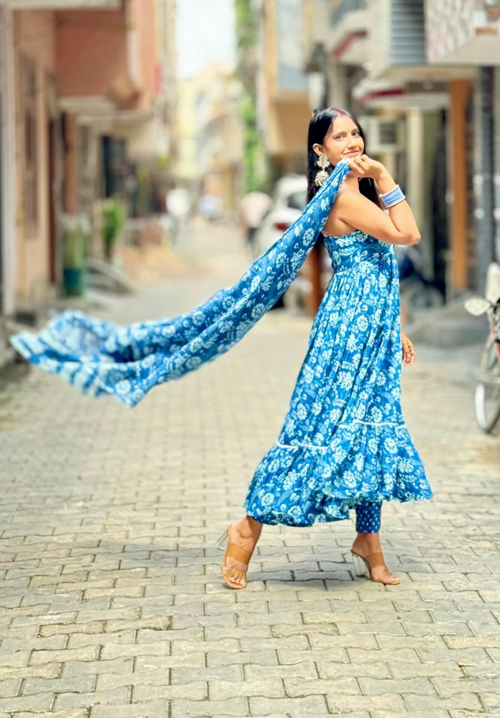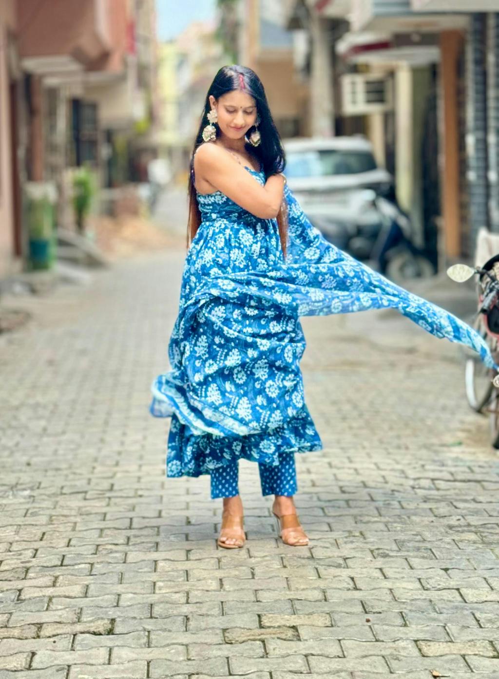 This Hyena Handblock Tiered Suit Set is like the love child of a forest bed and a clear blue sky. Imbibing the best of both worlds, it becomes a breathtaking blend of craftmanship, intricaccy and modernity. The flare just enhances the unique floral pattern, making it a dreamy ensemble to wear on winter outings with family and friends.