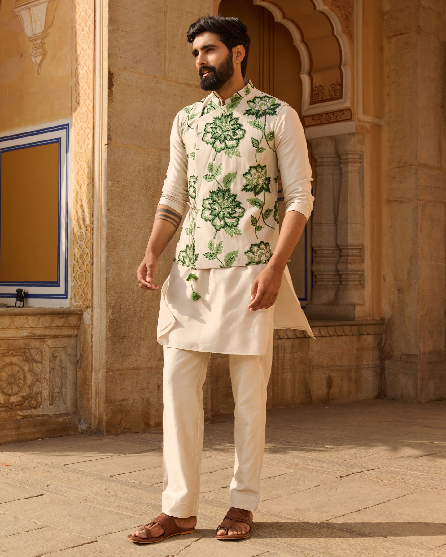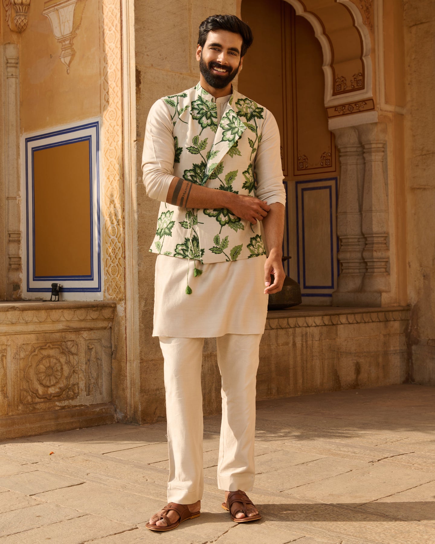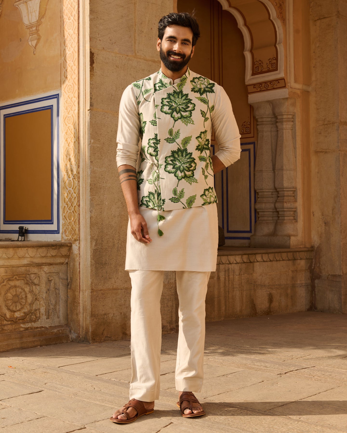Omkar Grey Printed Chanderi Jacket And Kurta Set