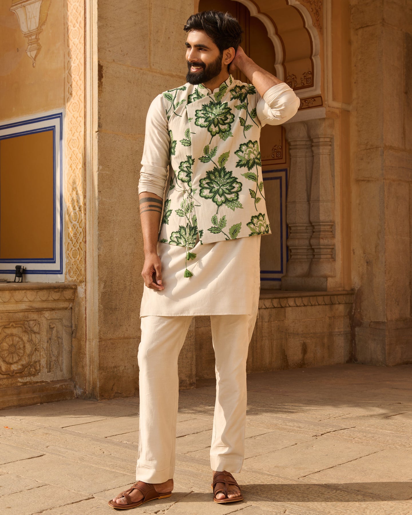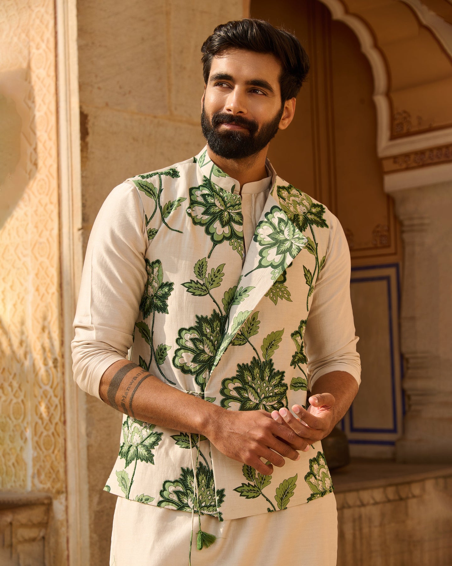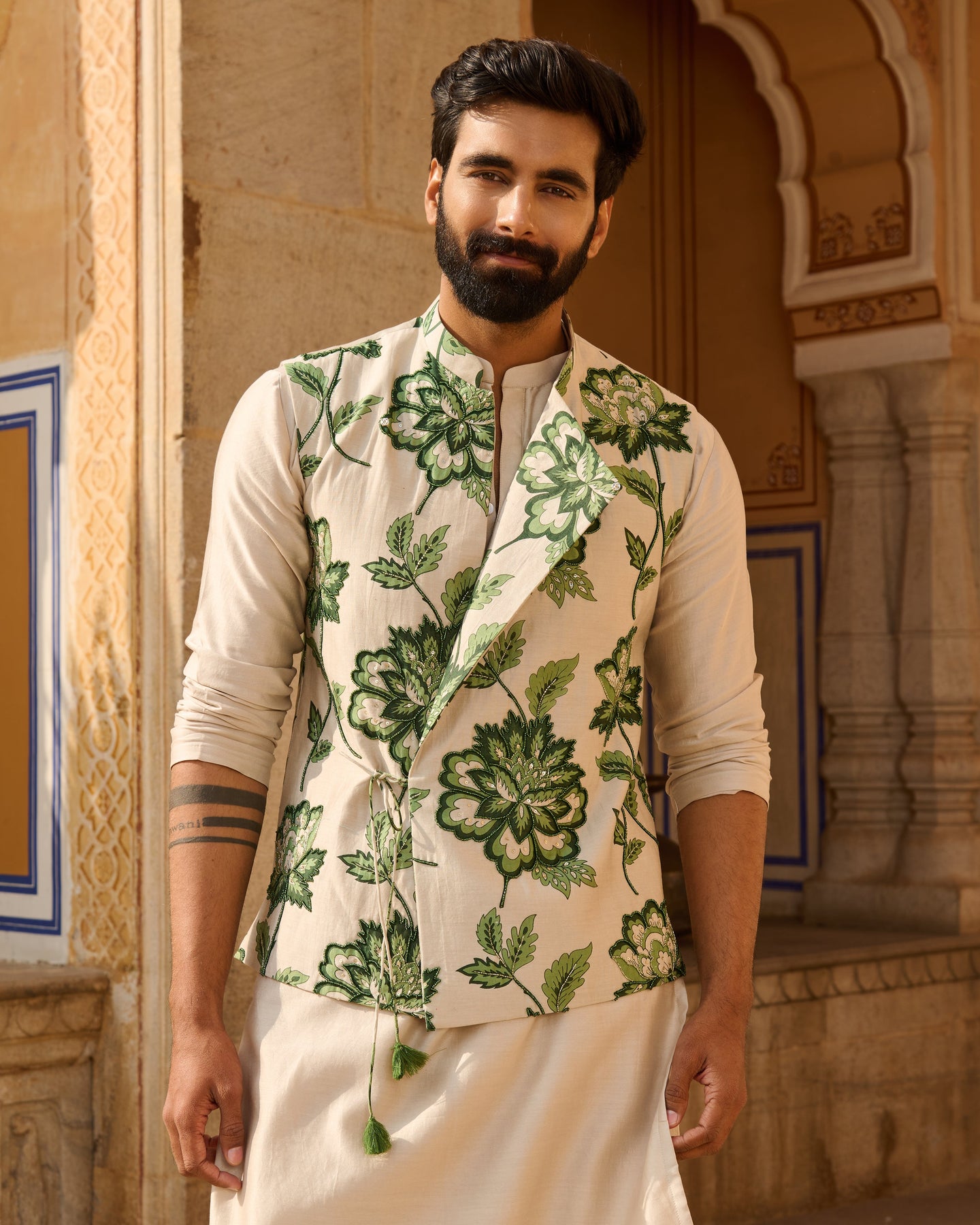 Omkar Grey Printed Chanderi Jacket And Kurta Set