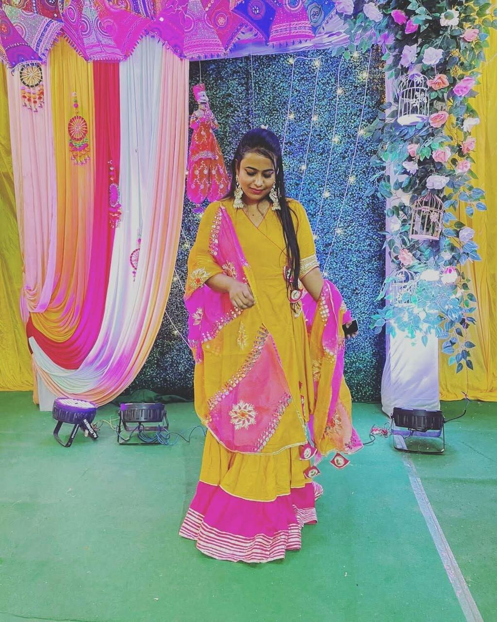 This three-piece Gota Patti Sharara suit set.
