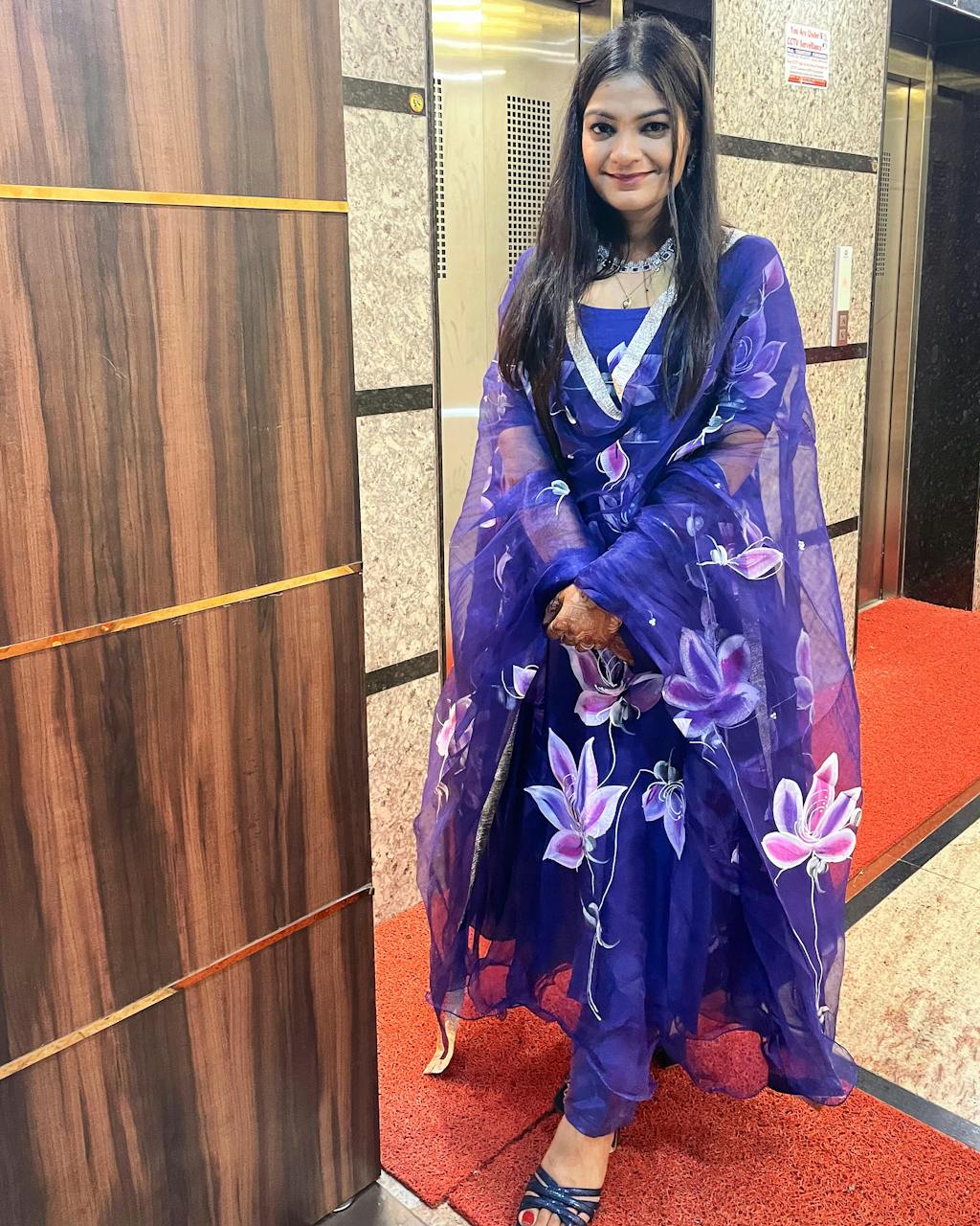 The Azra Handpainted Organza Suit Set portrays elegance in a bold demeanour while keeping the style in check. The lovely handpainted design on the Kurta and Dupatta makes it a fabulous choice for all the women who love to play valiant and modish. Color: Purple Suit Set Fabric: Organza/Satin Dupatta Fabric: Organza