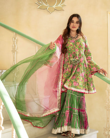 This beautiful sharara set in the hue of the nature is an ideal outfit for intimate events and wedding festivities like Mehendi. The shibori sharara is beautifully complemented with a floral jaal short kurti, organza dupatta and oh, those sleeve frills just add to the beauty of the whole set. Color: Green/Pink Suit Set Fabric: Cotton Dupatta Fabric: Organza