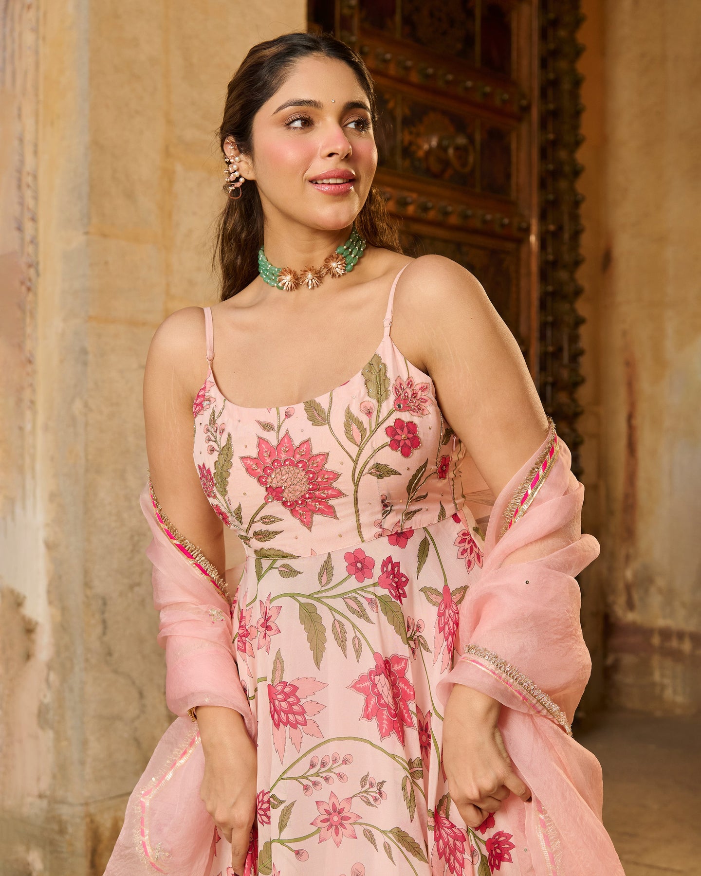 Belle Baby Pink Printed Viscose Organza Suit Set
