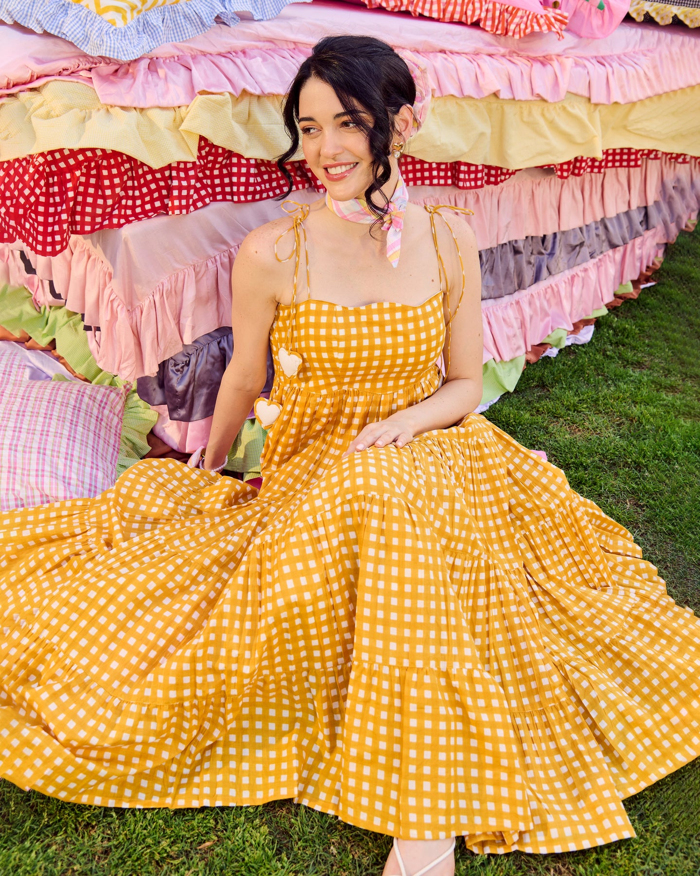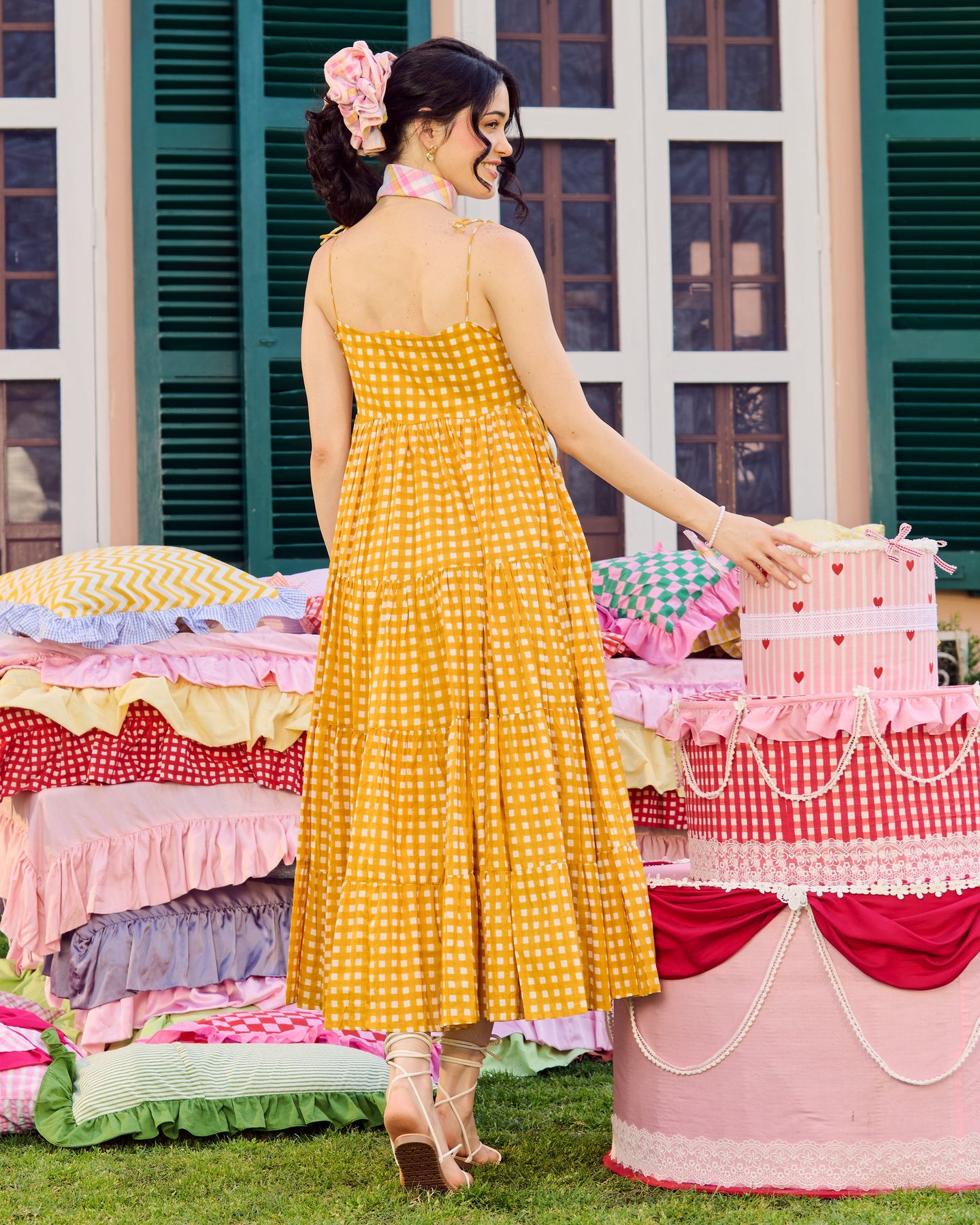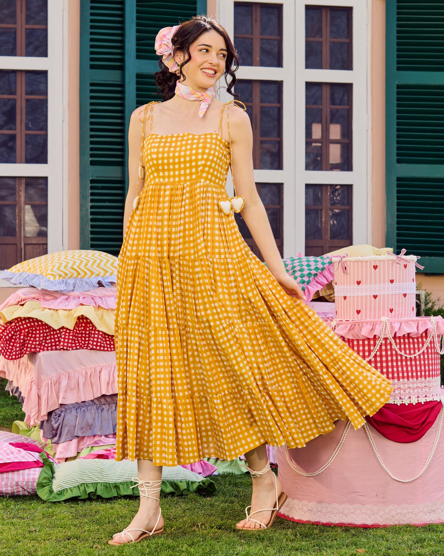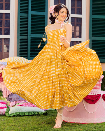 Ulfat Mustard Cotton Checks Printed Dress