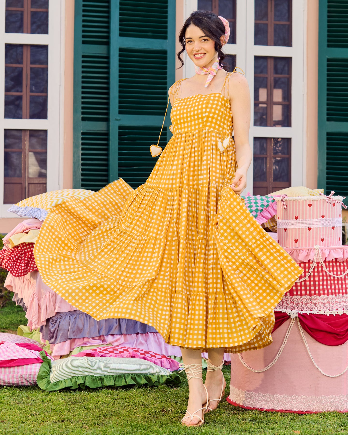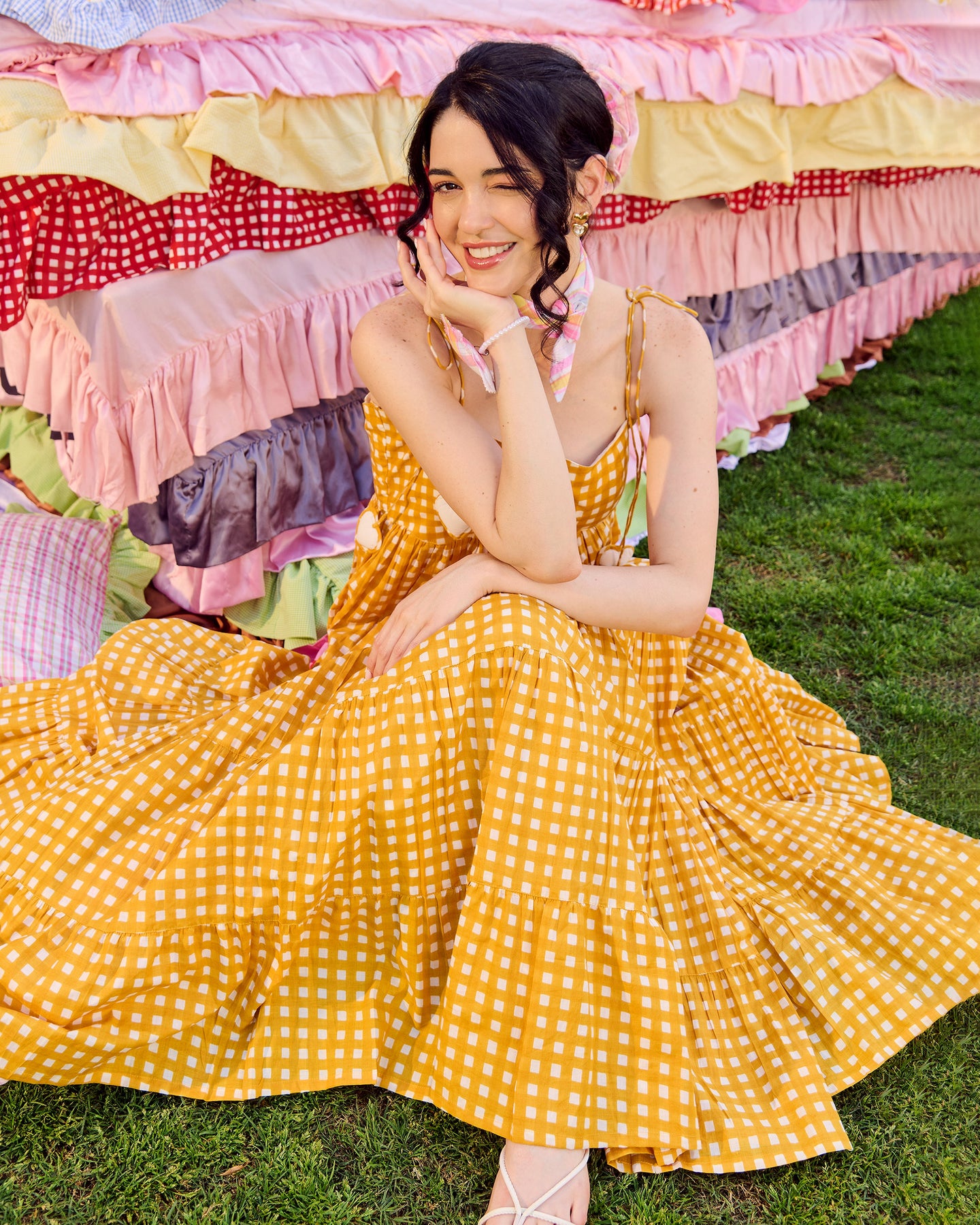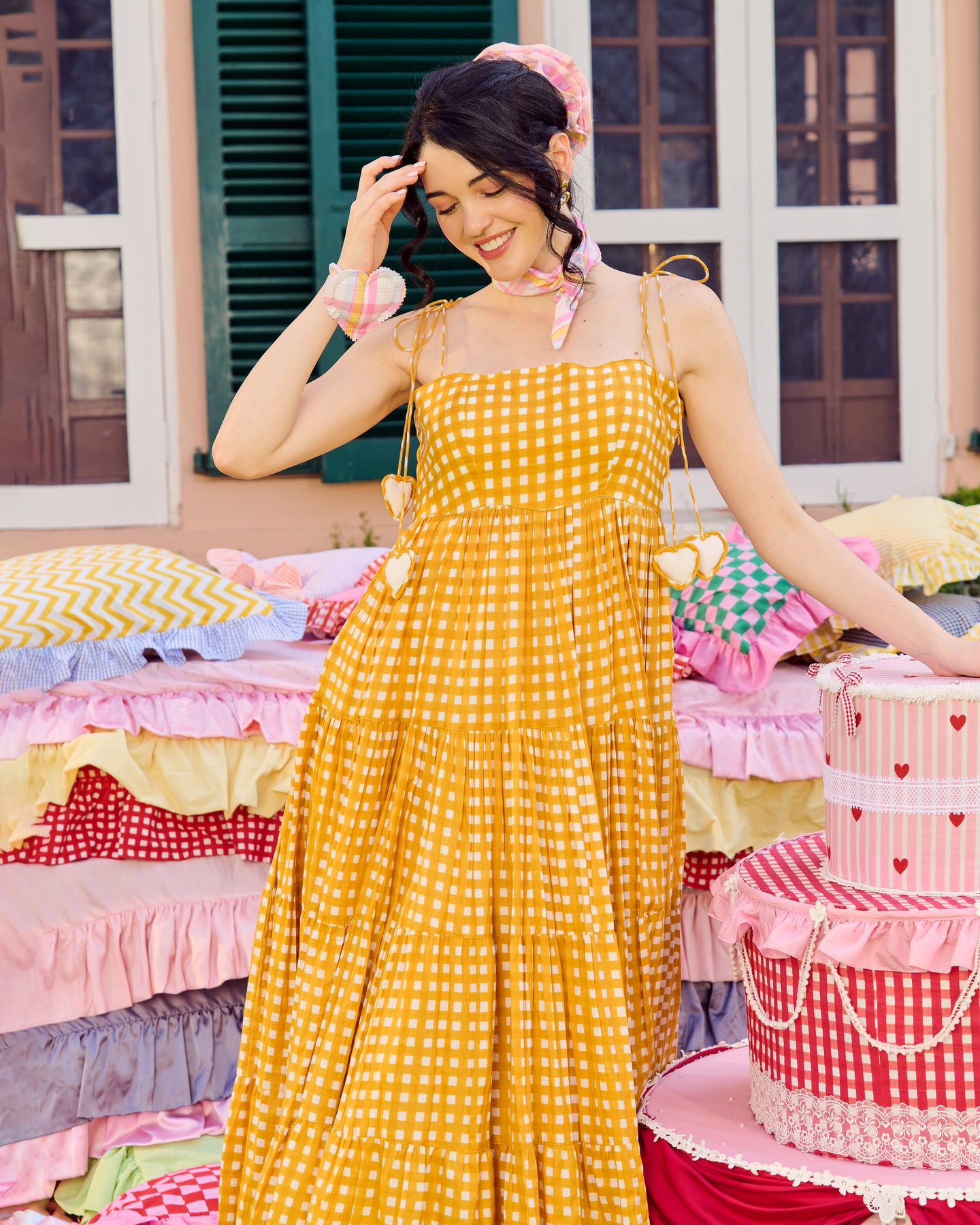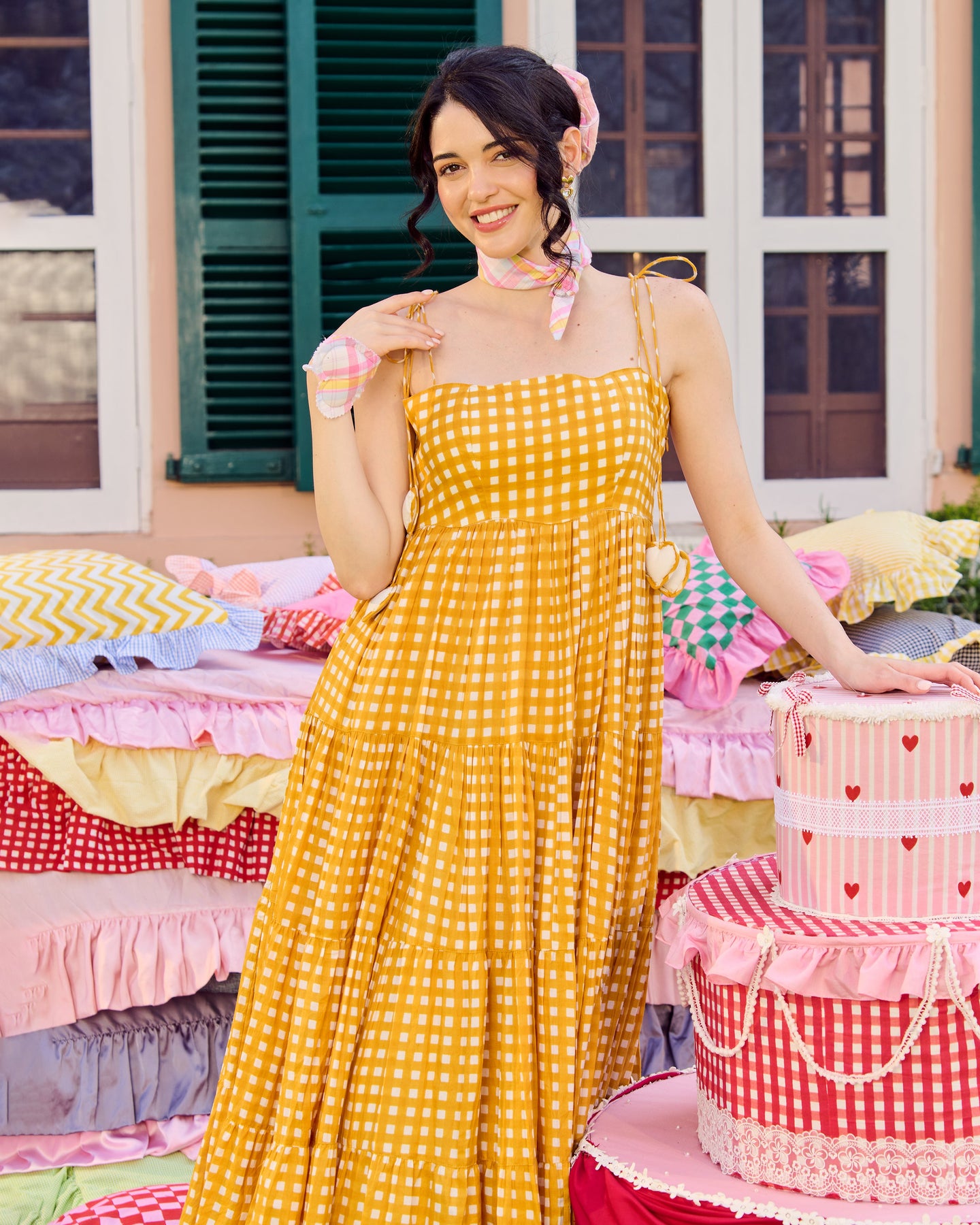 Ulfat Mustard Cotton Checks Printed Dress