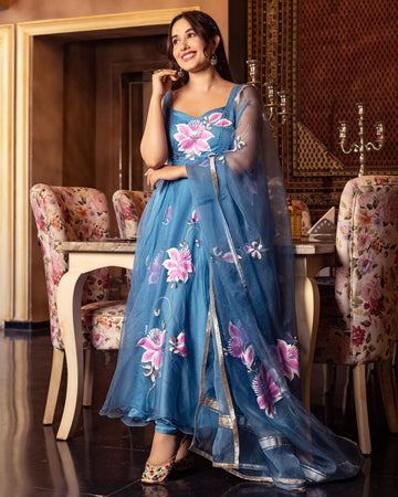 The Zaqra Handpainted Suit Set is an exquisite piece created to cherish the fond memories of our childhood in a beautiful hue of blue. The organza fabric lets you breathe spring air and make the outfit look dreamy while keeping the charm still. Color: Blue Suit Set Fabric: Satin/Organza Dupatta Fabric: Organza